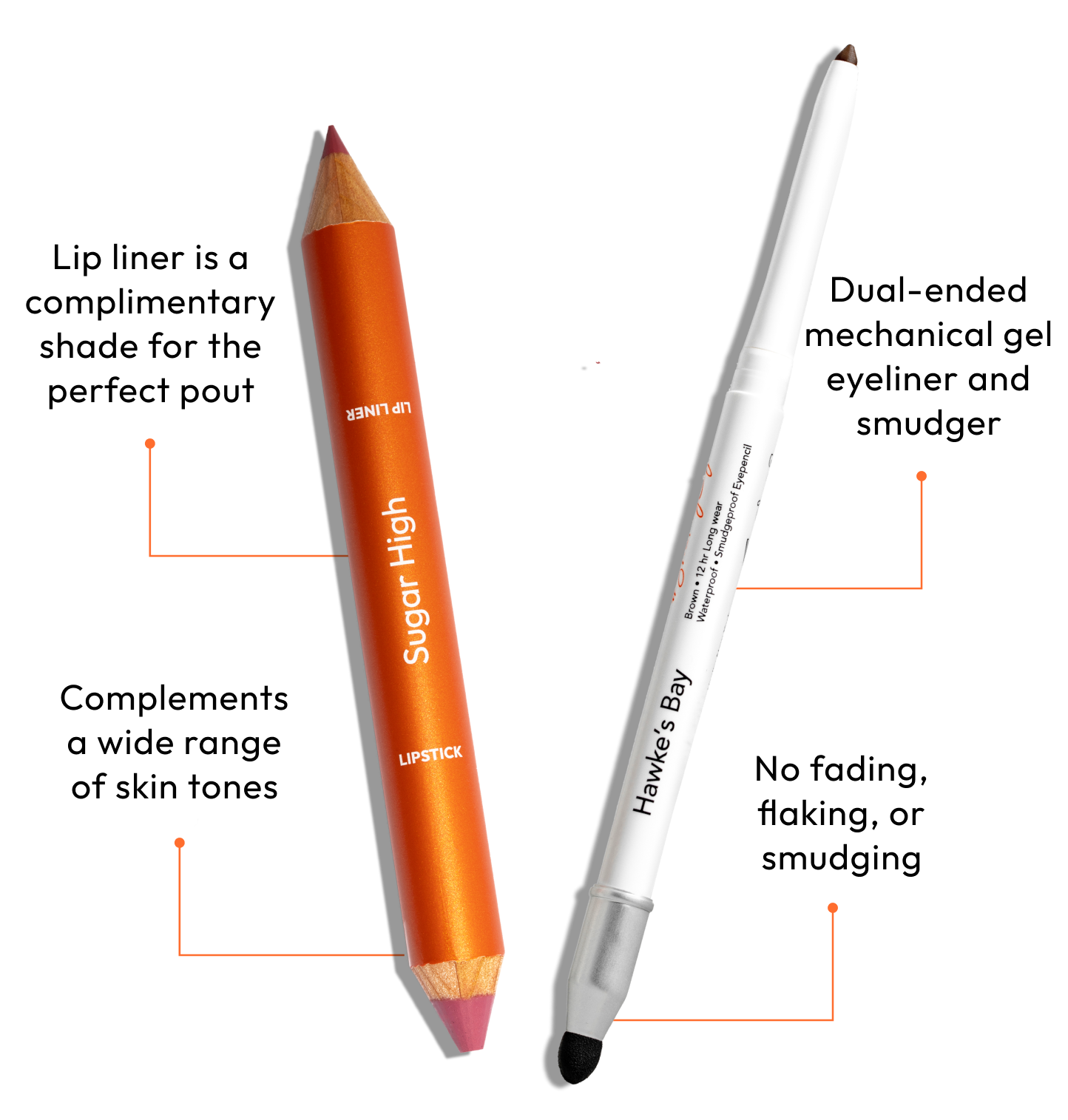 Hawke’s Bay - Gel Eyeliner: This dual-ended gel eyeliner, in a warm brown shade, suits all skin tones and eye colors, enhancing your unique allure. With a 12-hour wear formula, it effortlessly glides on for a lasting flirtatious charm, resisting fading, flaking, or smudging.